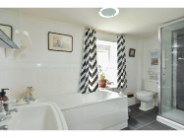This bathroom has a four piece white suite which consists of a large bath with mixer tap and shower spray that has a shelf above, Pedestal wash hand basin, Shower cubicle with mains shower within. Close coupled WC. There is a mirrored medicine cabinet with a light above the wash hand basin. In this room there is a cupboard with a hanging rail for storage. A shelved airing cupboard that has a radiator fitted inside. The shower has wet wall inside. The walls are tiled behind the wash hand basin and the bath. Radiator. The ceiling is fitted with a flush ceiling light. The floor is laid with tile effect vinyl.
